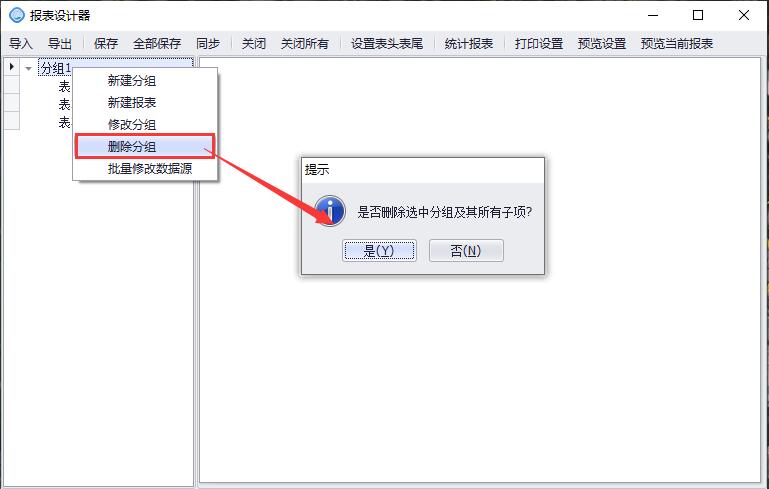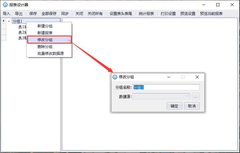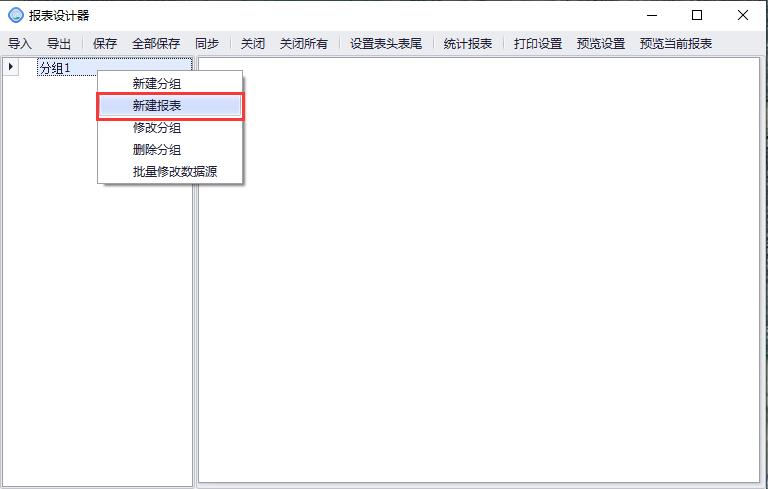 第一步:在设计器窗口左侧空白处右击鼠标,在弹出的菜单中选择“新建分组”,弹出新建分组对话框;