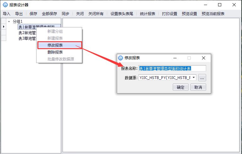 左键选中要修改的报表,右建弹出菜单,选择修改报表,打开修改对话框,可修改报表名称和数据源。